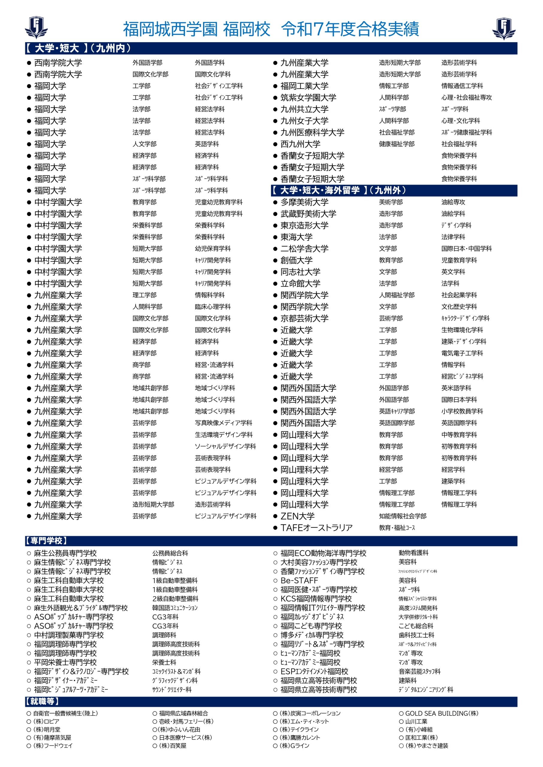 大学では「西南学院大学」、「福岡大学」、「中村学園大学」、「九州産業大学」、「福岡工業大学」など県内の大学はもちろん、「立命館大学」や「同志社大学」、「多摩美術大学大学」「武蔵野美術大学」など県外の大学にも多くの合格者が出ています。